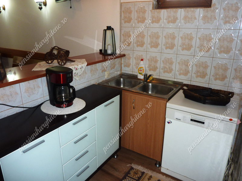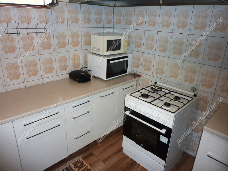 A Szabó Attila Vendégház alsó szintjén nappali, étkező, jól felszerelt konyha és egy toalett található.