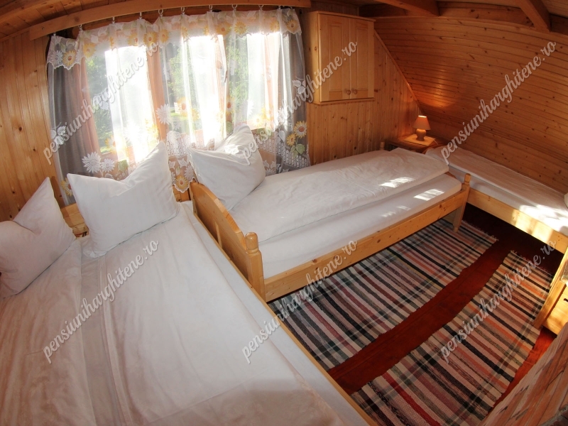 Az emeleten további három szoba és egy fürdőszoba áll a vendégek rendelkezésére. Az első emeleti szobában egy kétszemélyes és két egyszemélyes ágy található, míg a második és harmadik szoba két-két egyszemélyes ággyal berendezett.