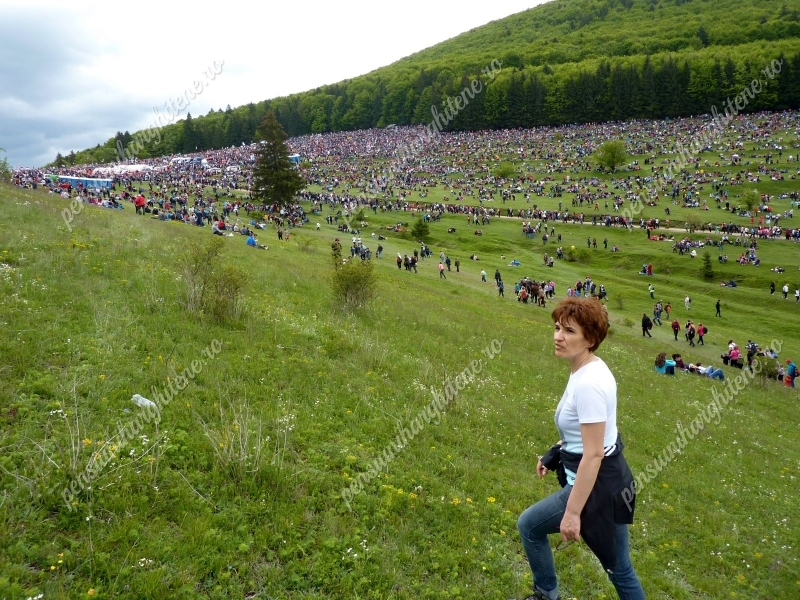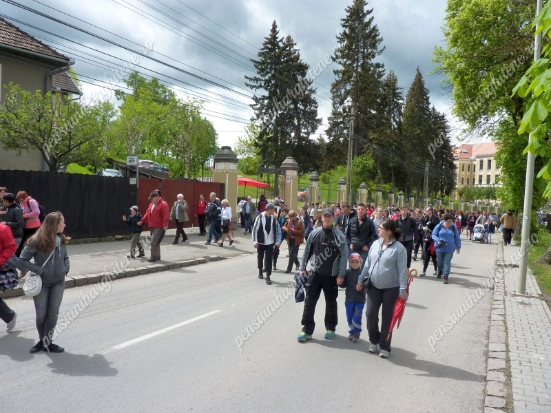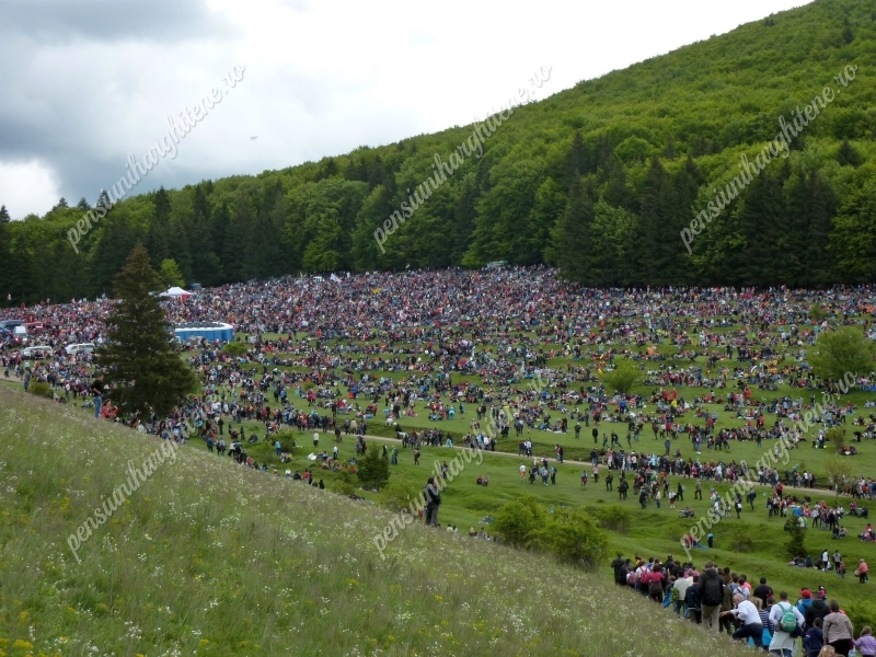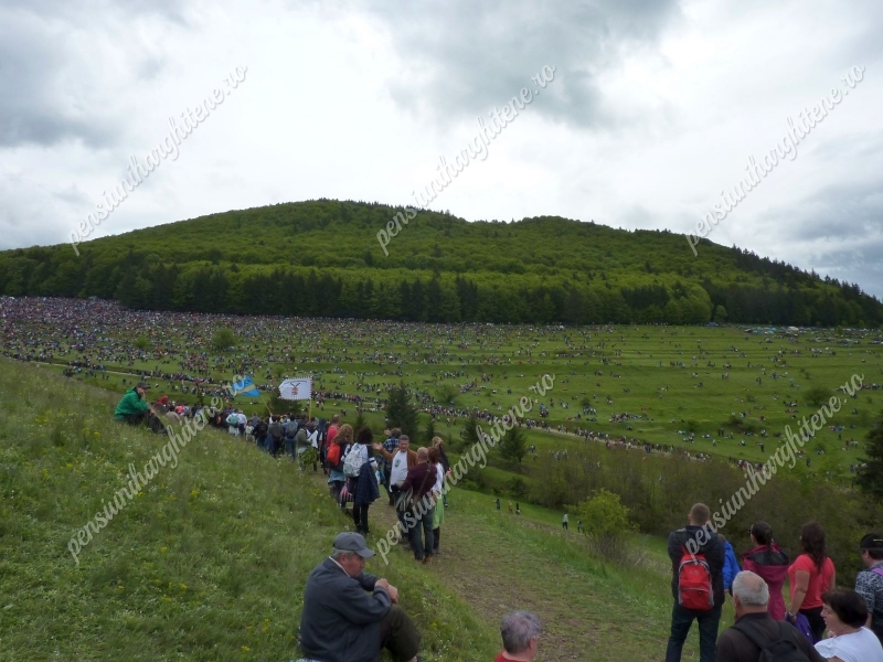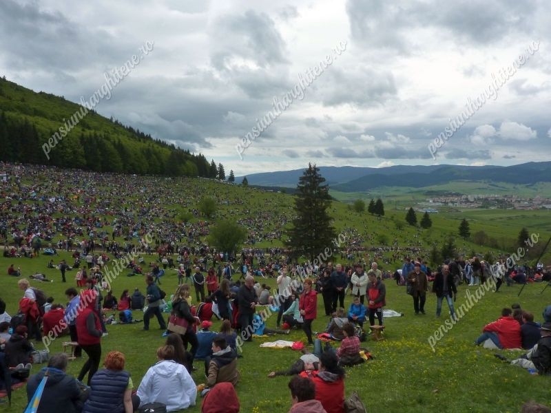 Kilenc órakor indultunk el a szállásunkról Csíksomlyóra. Andi, Tomi, Zsani, Edit és Éva. Ahogyan közeledtünk, kilométereken keresztül már csak lépésben haladtunk, hömpölygött a tömeg a zarándokhely felé. „Véletlenül” Andi dobott egy balost egy rendõr mellett, ezért sikerült a tavalyi évekkel ellentétben most egy szuper parkolóhelyet találnunk a szántóföldeken. (zabföld volt…) Az utolsó helyeket foglaltuk el a „parkolóban”, ahol még nem süllyedtünk be a sárba. Rengetegen voltunk, gyülekeztek a zarándokok, gyalog, kocsival, buszokkal. Jó volt csatlakozni a zsibongó tömeghez, ki milyen céllal érkezett nem számít, valahol egy biztos: Isten áldása kísért minket. Mindenkinek arcára volt írva a várakozás, a tisztelet e szent nap iránt.
