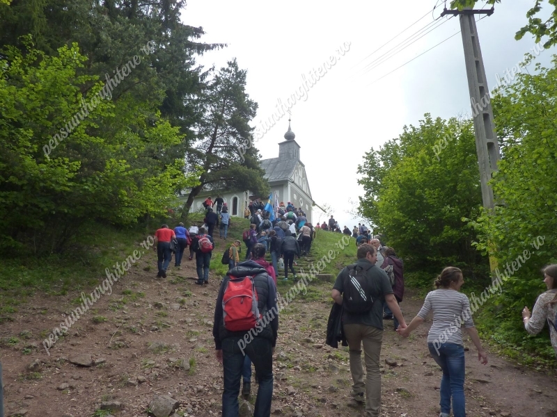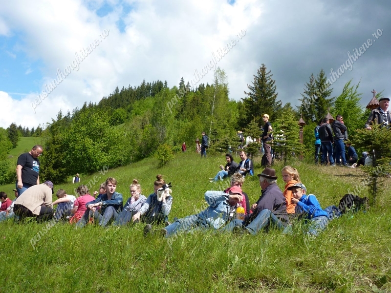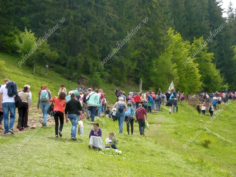 A hegy lábánál vártak minket a csángó gyermekek és fiatalok, akik felvezették a zarándokokat együtt a 13 stáción keresztül a Jézus hágón a hegyre. Lentrõl felnézve elállt a lélegzetünk egy percre, hogy ezt ennyi csomaggal ilyen meredeken és teljes sötétségben képesek legyünk megmászni, de elindultunk. Felfelé menve az emelkedõtõl mi tényleg nagyon kapkodtuk a levegõt, a csángók viszont hangosan énekeltek és furulyaszó kísérte õket. Minden stációnál megálltunk és két gyermek zseblámpa fényénél felolvasta Jézus szenvedéseibõl melyik stáció mit jelképez és mesél el. Minden egyes állomásnál gyertyák égtek, de amúgy szinte vaksötét volt. Csúszkáltunk, kicsit izgalmas volt mi lenne, ha fentrõl valaki ránkborulna, mint a dominók… Ha megcsúsztunk, máris alánk karoltak, felsegítettek, nem eshetett bajunk. A kicsi gyermekektõl kezdve az öreg, viseletbe öltözött nénikékig és bácsikákig, mindenki lelke eggyé vált és biztosak vagyunk benne, hogy Isten is ott volt velünk. A hegy lelke, azok lelke, akik valaha megtették ezt az utat és a mi lelkünk összeforrt, és ez az ERÕ vitt bennünket tovább felfelé.