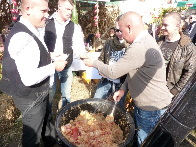 A varrottasokkal, káposztafejekkel és őszi terméssel feldíszített sátrak között volt olyan csapat is, amely szemrevaló épített motorkerékpár mellett főzte az üstben a töltött káposztát. A motorosok specialitása a gulyás, de a hal elkészítéséhez és a töltött káposztához is értenek, és bár főzőhelyük díszítése teljesen eltér a hagyományostól, mégis szeretnék bizonyítani, hogy azok is érthetnek a töltelékek elkészítéséhez, akik csak másoktól ellesve tanulták azt.